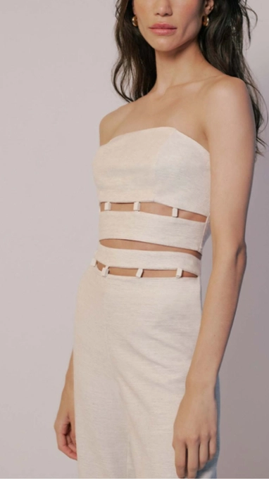 - Detalhes vazados na cintura com miçangas trazendo um toque moderno e levemente sensual para a peça, deixando uma pequena parte da pele a mostra.