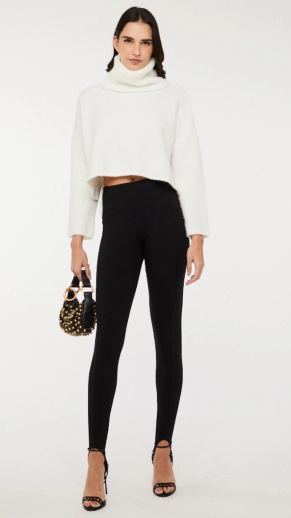 Modelagem ajustada e cós alto que desenha a silhueta com perfeição. Passante de pé moderno e funcional e detalhe metálico discreto na cintura.