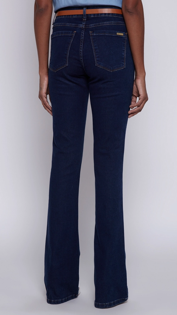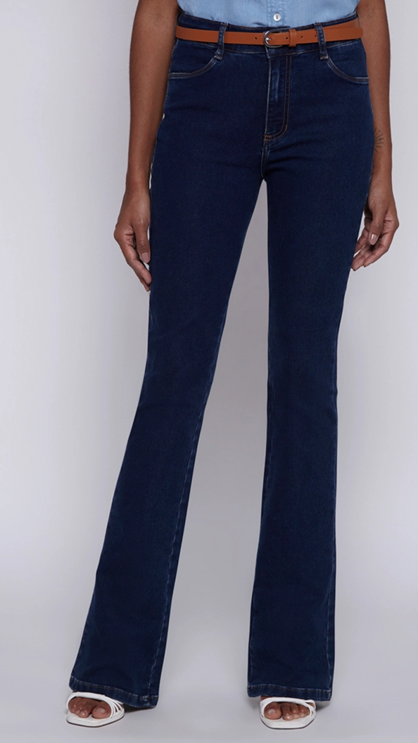 - Modelagem bootcut, sendo mais ajustada na cintura, no quadril e nas pernas abrindo na barra.