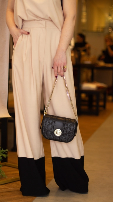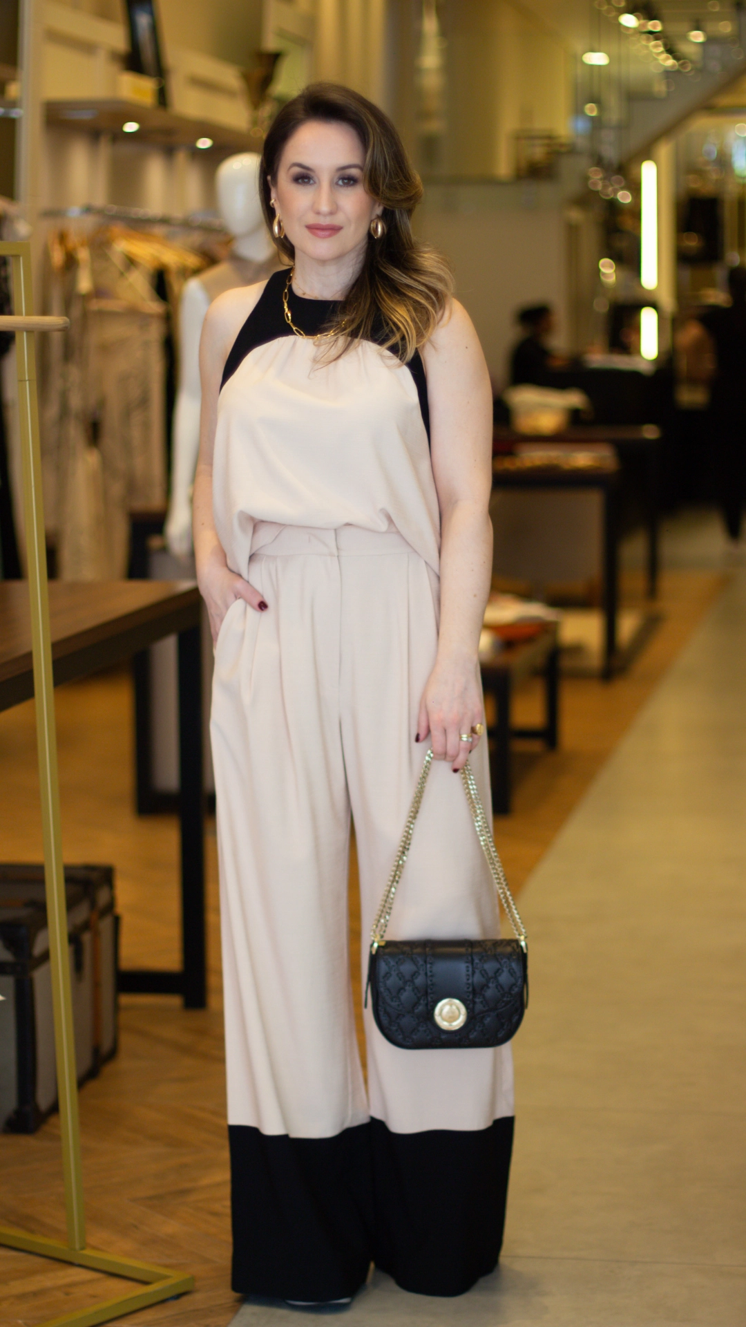 Modelagem pantalona alongando a silhueta e trazendo sofisticação ao look. Perfeita para quem busca elegância e conforto em produções especiais.
