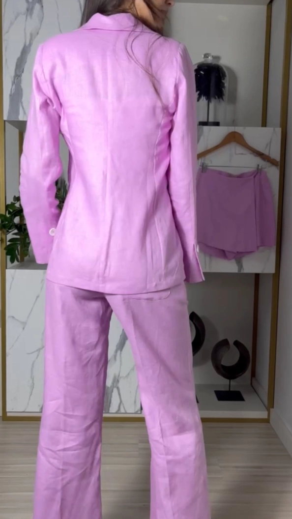 - Modelagem pantalona, ajustada na cintura descendo com caimento amplo até a barra.