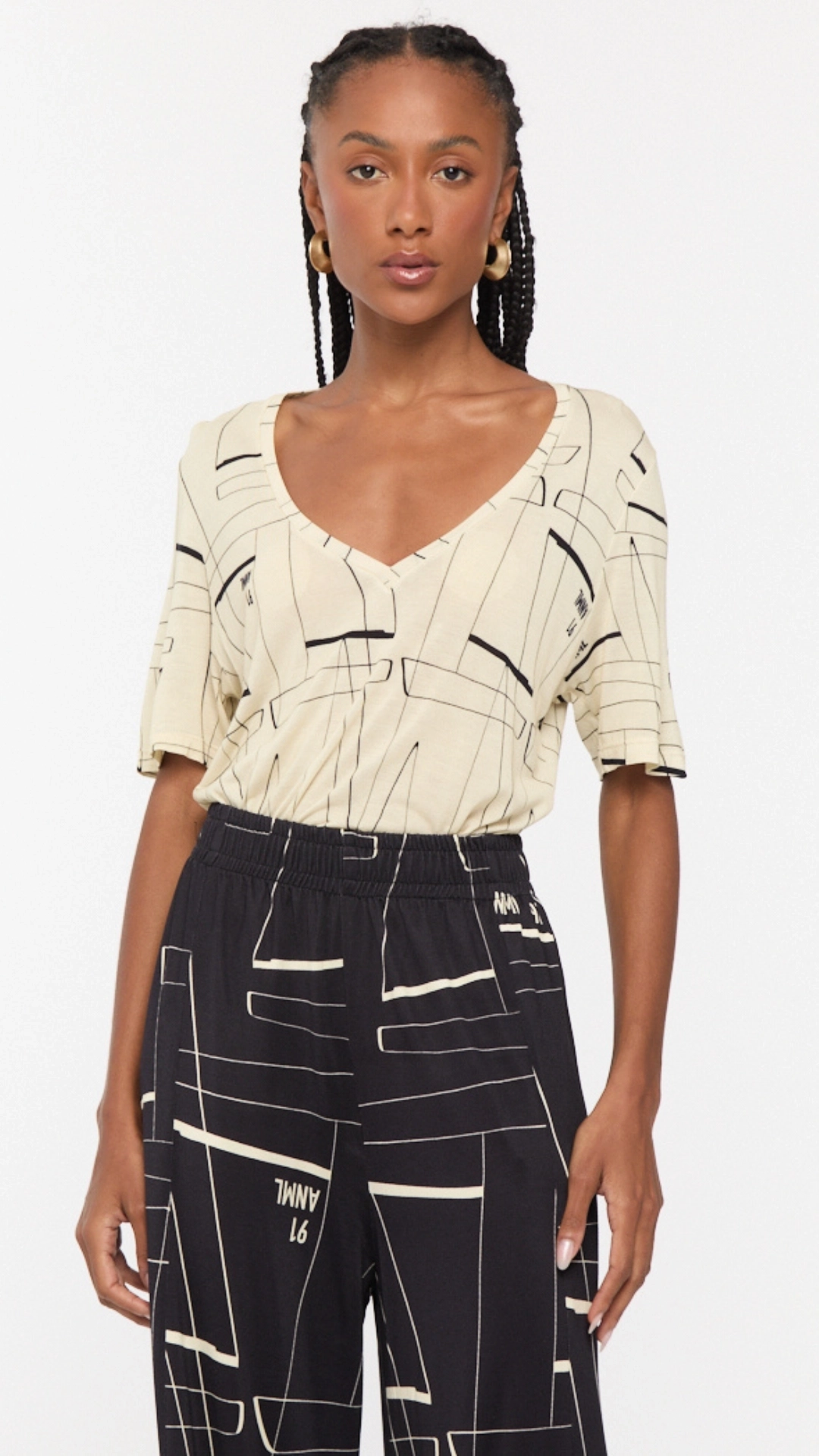 Estampa geométrica exclusiva e decote em V valorizando o colo. Modelagem reta com mangas oferecendo leveza e caimento impecável, ideal para o dia a dia ou produções elaboradas.