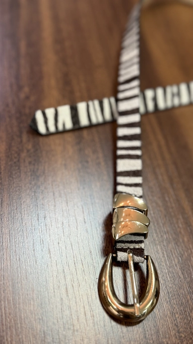 Cinto 100% couro com acabamento em pelo e detalhes em metal dourado. Largura de 2cm, ideal para composições elegantes, trazendo um toque de estilo sem pesar. Fivela Zamak - alta resistência para uso diário.