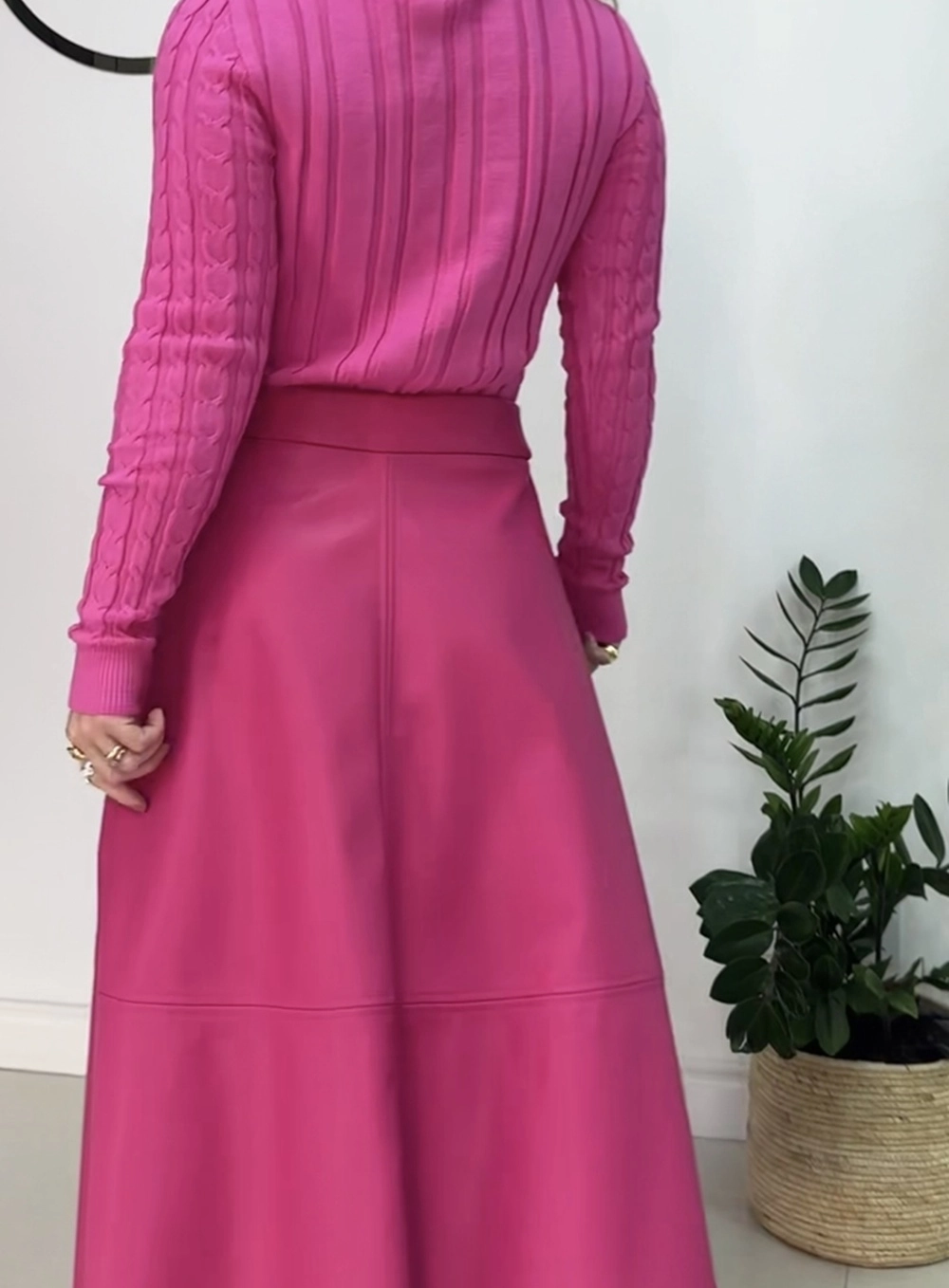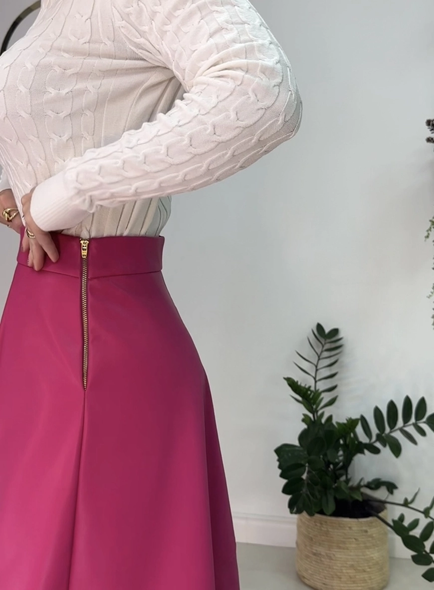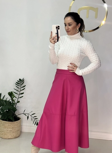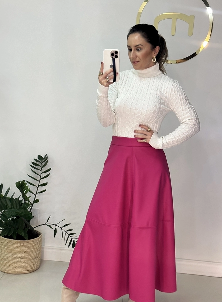 A saia em pu é aquela peça indispensável no guarda roupa, vai bem em diversas ocasiões e com diferentes combinações.