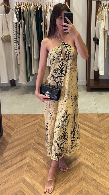 vestido longo animale frente unica folhagem nanquim